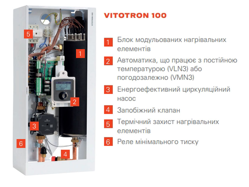 Встановлення котла Vitotron 100 коштує недорого і не вимагає підключення до газової системи, проведення димовидалення, котельні або приміщення для зберігання палива. Для роботи пристрою достатньо можливість підключення до електричної мережі.
